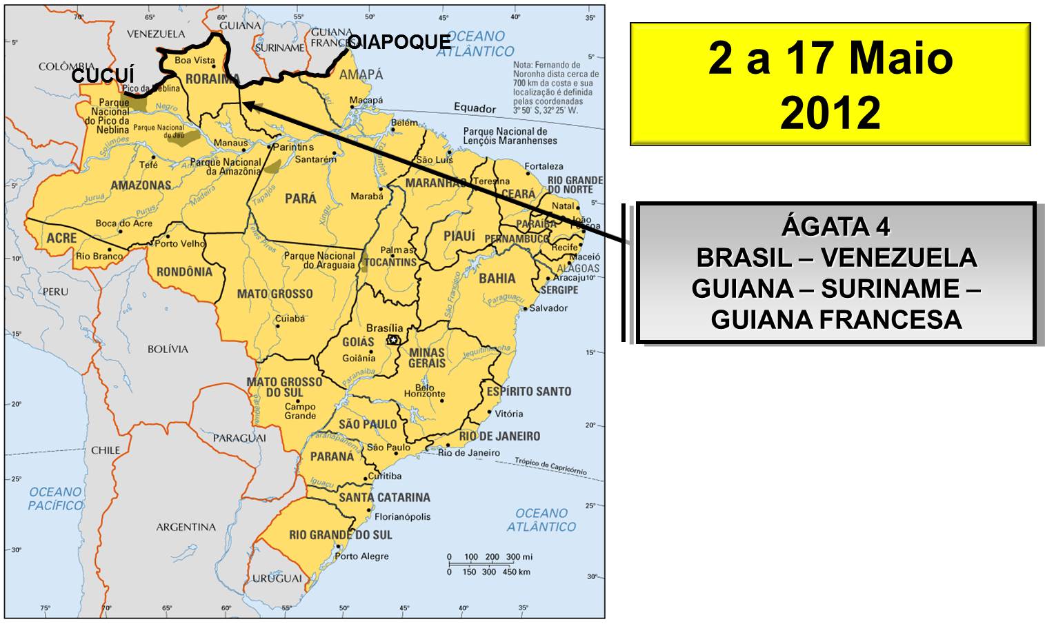 Este trabalho versa sobre a segurança e a defesa da fronteira Amazônica, em especial, durante a Operação Ágata 4 realizada entre os dias 02 e 17 de maio de 2012 na Amazônia setentrional. A operação, estruturada pelas diretrizes da Estratégia Nacional de Defesa e pelo Plano Estratégico de Fronteiras, ocorreu na fronteira entre o Brasil e os seguintes países: Guiana, Guiana Francesa, Suriname e Venezuela. Entre os objetivos do Governo Federal, das Forças Armadas e dos órgãos de segurança pública estava a contenção dos ilícitos transnacionais na região. A Amazônia possui pluralidade de contextos e é área prioritária para o Estado Brasileiro.