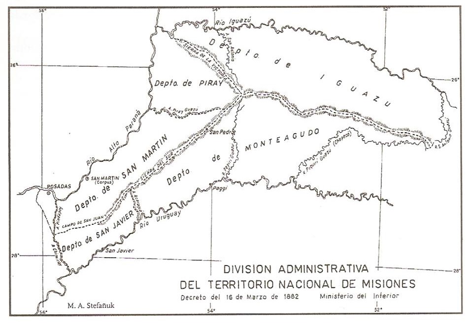 - Mapa argentino datado de 1882 onde o então Território Nacional de Misiones incluía as áreas a leste dos rios San Antonio e Pepirí Guazú, equivalentes atualmente às partes oeste dos estados do Paraná e de Santa Catarina.